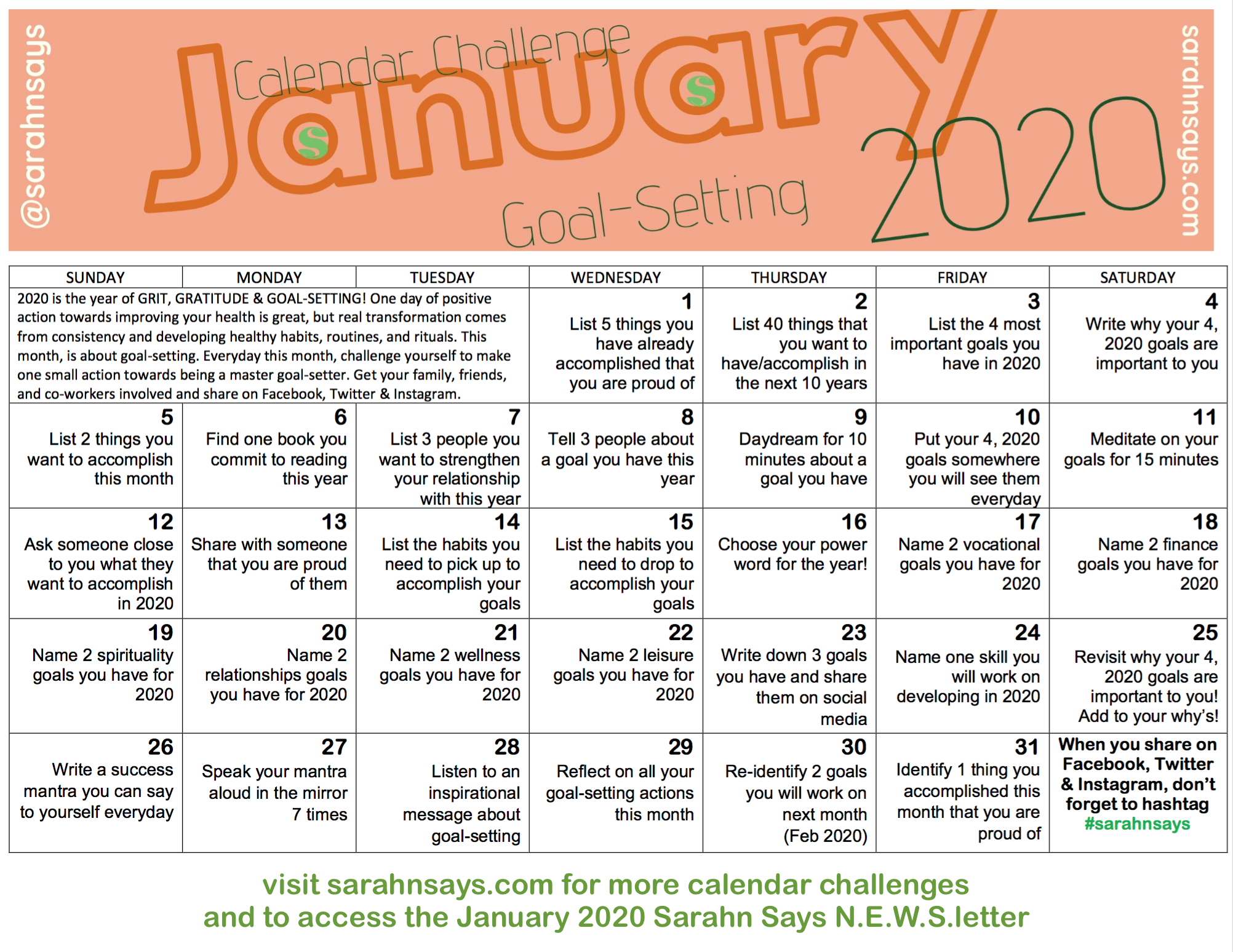 2020 is the year of GRIT, GRATITUDE & GOAL-SETTING! One day of positive action towards improving your health is great, but real transformation comes from consistency and developing healthy habits, routines, and rituals. This month, is about goal-setting. Everyday this month, challenge yourself to make one small action towards being a master goal-setter. Get your family, friends, and co-workers involved and share on Facebook, Twitter & Instagram. When you share on Facebook, Twitter & Instagram, don’t forget to hashtag #sarahnsays